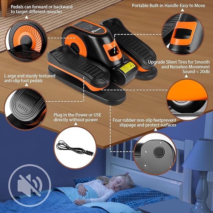 - 【LCD Display】WESEC Under Desk Elliptical Machine has an LCD display that tracks speed, distance, counter, time and calories in real time. This seated pedal exerciser for seniors comes with a thoughtful remote control that allows you to switch modes without bending over and taking pressure off your back. This means you can sit back and work or relax while still getting the workout you need!