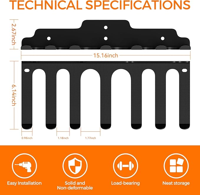 - Sturdy & Durable - The heavy-duty wall-mounted organizer is made of high quality steel plate. Then there is a thick, durable, coarse powder coating on the surface. All the fingers/combs are spaced apart to avoid overlapping, thus protecting your equipment and shelves from scratches