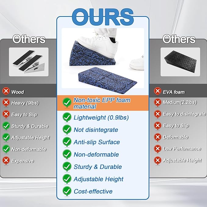 - ※ DETAILS MAKE THE DIFFERENCE : Slant Board for Calf Stretching uses EPP environmentally friendly materials that are non-toxic, odorless, waterproof, and oil-proof, 100% recyclable, and almost no performance degradation.foam wedge can withstand 440 lbs.compared with the slant board on the market, our products have the advantages of light weight and easy storage. they can be moved to every place in the house at will and can be reused many times.