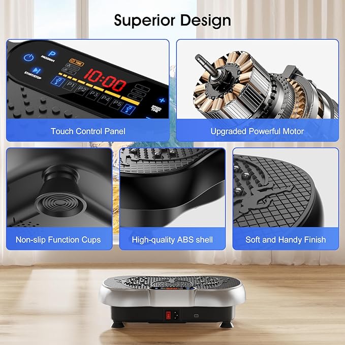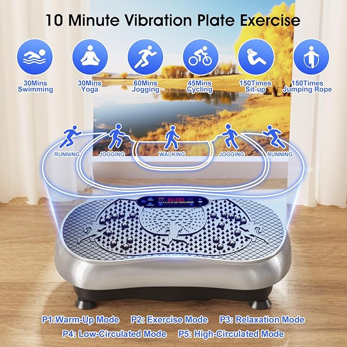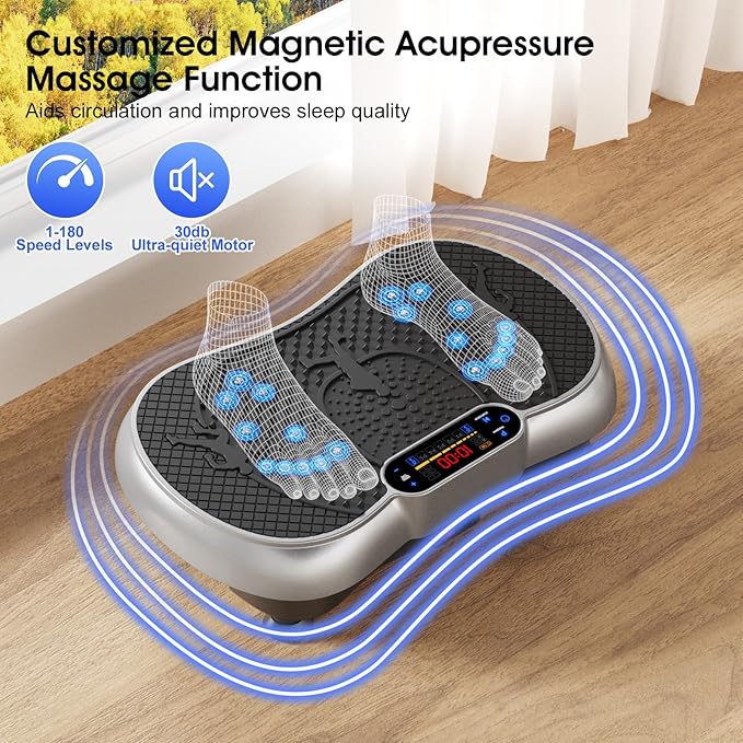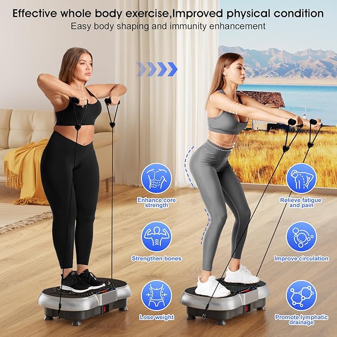- ✅【Tailored features for different needs】: The vibration platform machine features 5 automatic modes, 1 manual mode, adjustable vibration speed (1 to 180), comes with 2 resistance training bands to work both the upper and lower body. You can combine these vibration routines with exercises such as squats, lunges, sit-ups, push-ups and yoga. 10-minute workout per day increases bone mineral density, allowing you to effortlessly achieve a perfect physique.