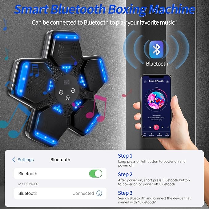 - BLUETOOTH MUSIC & REAL-TIME TRACKING: Connect your phone via Bluetooth to play your favorite songs during training. The smart HD display accurately tracks every punch, creating a more interactive and energizing training environment.