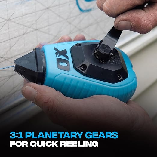 OX Pro 100ft Chalk Line ABS Plastic with Rubber Grip with Chalk Powder 4oz - 6:1 Gear Ratio with Cotton Nylon Standard Bold Line Pointed Tip Chalk Line Tool OX-T630602