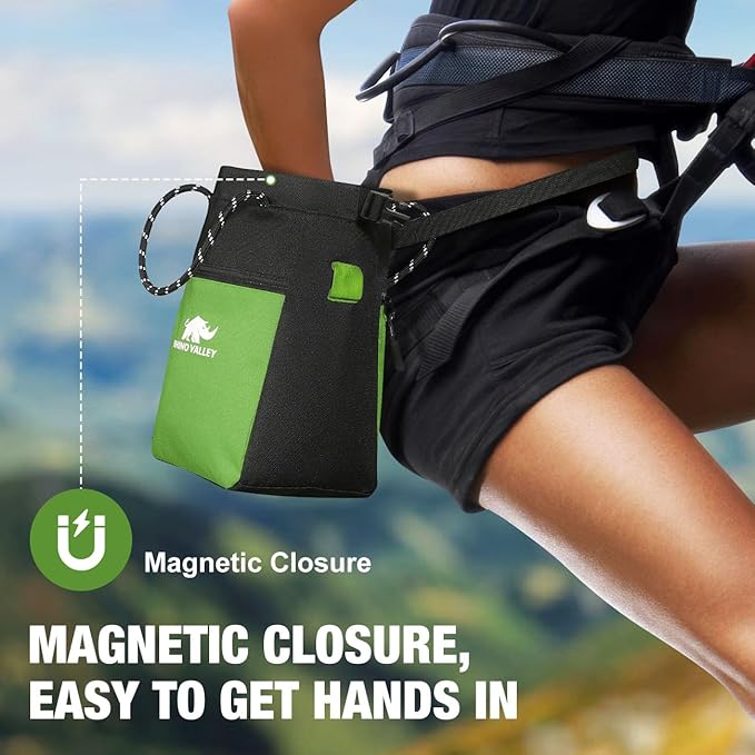 Rhino Valley Chalk Bag for Rock Climbing, No Leak Magnetic Climbing Chalk Bag with Handle, Climbing Chalk Bucket Gear with Adjustable Belt Zipper Pockets for Cross Fit, Weight Lifting