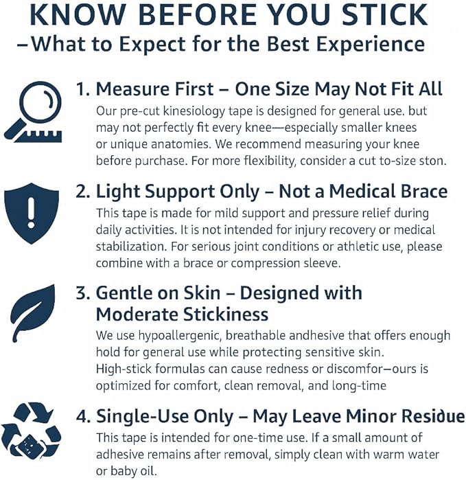 - Precut for Perfect Fit & Easy Application: Unlike traditional kinesiology tape that requires manual cutting, our kinesiology tape precut strips come ready to use, specifically designed for knee pain relief. This pre-cut knee tape ensures precise placement, saving you time and effort while delivering consistent, reliable support every time.