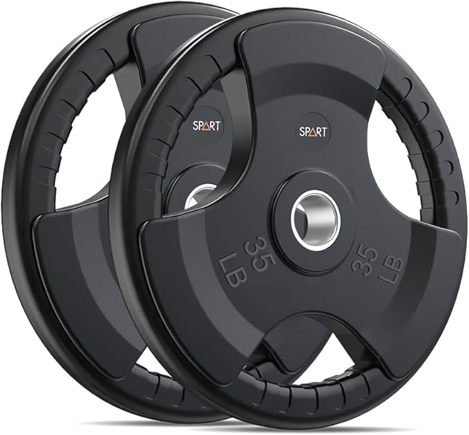 - 💪FEATURE: SPART weight plates have a solid iron core and slide rubber surface. This design can protect the floor from damage and ensure enough weight when you do exercise. The strong steel ring insert can help you assembly the barbell easily. The three holes are designed for grip according to your hands and you can do weightlifting exercise with single plate as well.