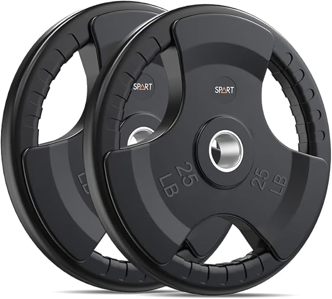 - 💪FEATURE: SPART weight plates have a solid iron core and slide rubber surface. This design can protect the floor from damage and ensure enough weight when you do exercise. The strong steel ring insert can help you assembly the barbell easily. The three holes are designed for grip according to your hands and you can do weightlifting exercise with single plate as well.