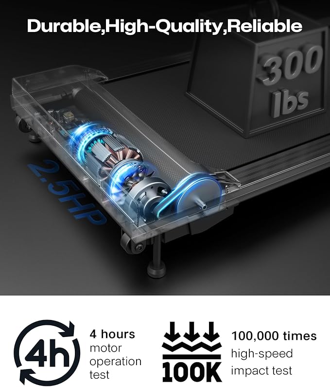 - Built to Last - Rigorously Tested for Durability: Engineered for long-term reliability, this walking treadmill has undergone extensive testing (100,000+ cycles and impact tests). With a 2.5HP peak motor and 550W continuous power, it delivers consistent performance without wear and tear.