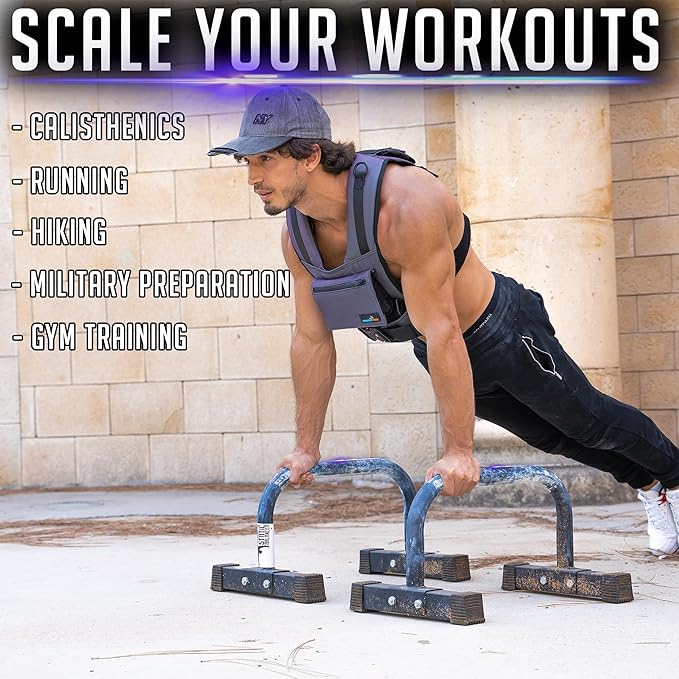 - WEIGHTED VEST - Includes 20 iron weights 10 in front and 10 in back for equal weight distribution. Each weight individually wieghs 2.2lb (1kg). Weight and fit are fully and comfortably ajustable for both men and women.