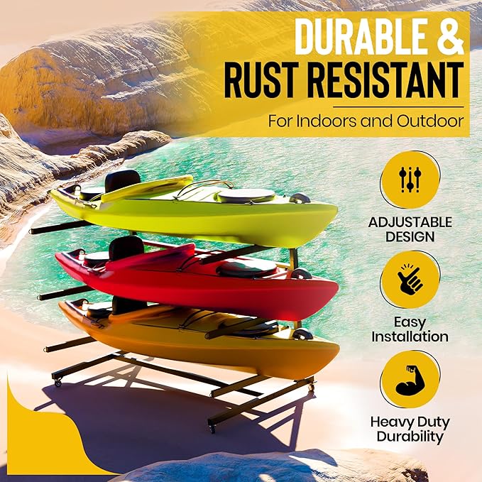 - Enhanced Stability | This freestanding kayak rack features a reinforced base for maximum stability, even on uneven surfaces. Use it confidently as a kayak rack outdoor option or as a 3 kayak storage rack for your dock or deck. Its sturdy design ensures safe storage for your gear, whether it’s a canoe, SUP, or kayak. It’s also a reliable kayak rack for garage and dock kayak rack.