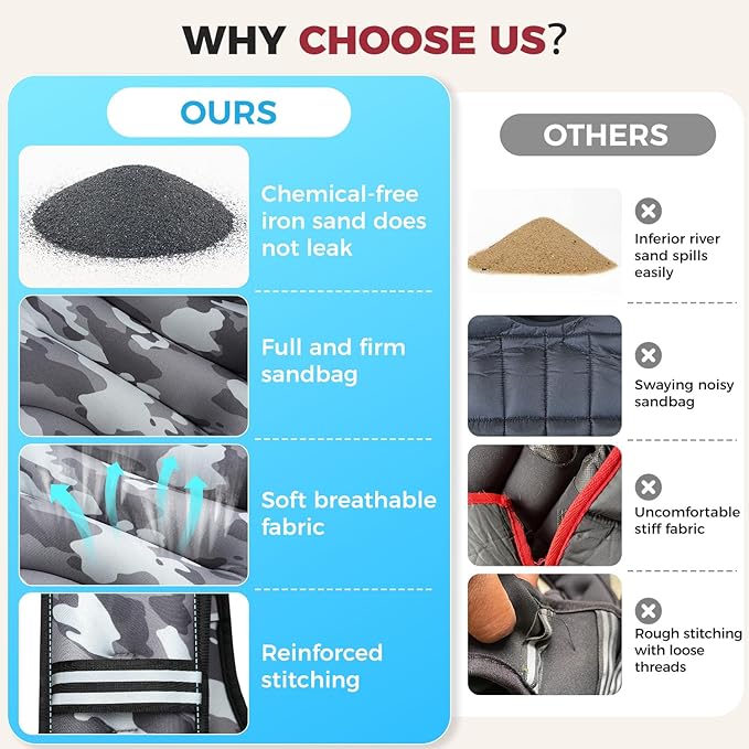 - Superior Performance: Our weighted vest features upgraded iron sand with even weight distribution, maximizing workout efficiency and minimizing injury risks. Reinforced double-stitched seams prevent sand leakage, ensuring a secure and durable experience for safe, effective training