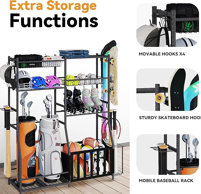 - ๐๐ฎ๐ฅ๐ญ๐ข๐๐ฎ๐ง๐๐ญ๐ข๐จ๐ง๐๐ฅ ๐๐ฉ๐จ๐ซ๐ญ๐ฌ ๐๐ช๐ฎ๐ข๐ฉ๐ฆ๐๐ง๐ญ ๐๐ซ๐ ๐๐ง๐ข๐ณ๐๐ซ: Equipped with storage baskets of different sizes, 2 golf storage racks, basketball storage boxes, racket racks, and 4 suspension brackets, it can meet your storage needs for different items