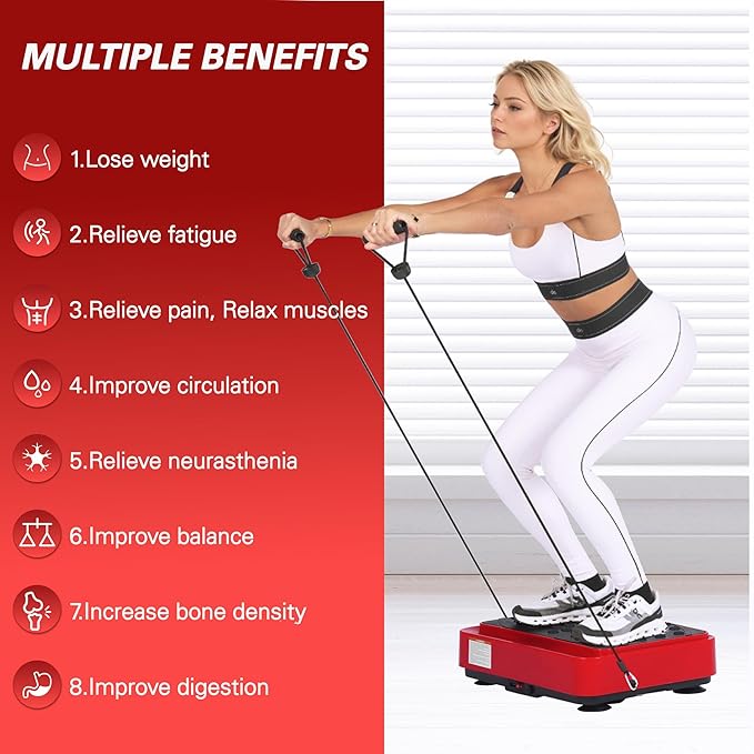- 【Rich and Efficient Features】The vibrating plate for lymphatic drainage adopts the latest vibration technology to simulate the natural process of fat burning during exercise. Provide 10 exercise modes: ① 9 automatic modes② manual mode: 1-99 adjustable frequencies. Equipped with 2 resistance exercise bands, it can simultaneously exercise both the upper and lower body.Exercising only 15-30 minutes a day can increase bone mineral density, reshape body lines, and relieve and reduce stress levels