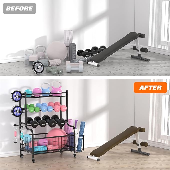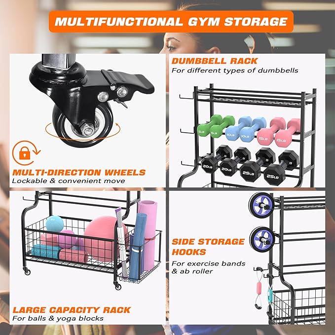 Dumbbell Rack Home Gym Weight Rack for Dumbbells, Kettlebells, Foam Rollers, Yoga Mats and Resistance Bands, Workout Gear Organizer With Wheels