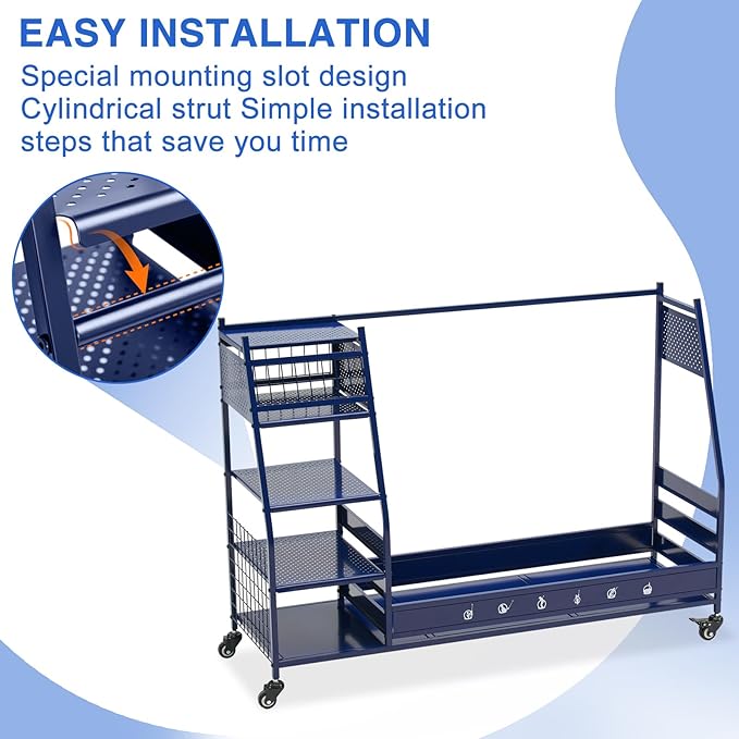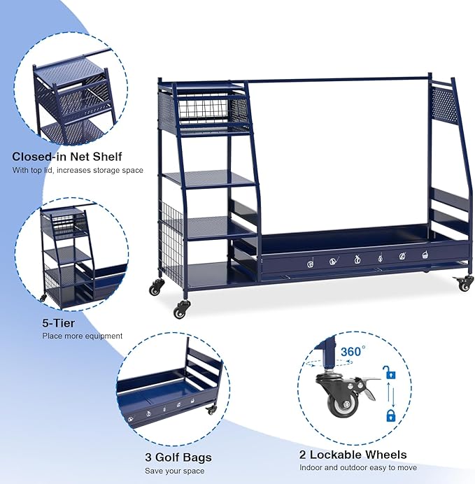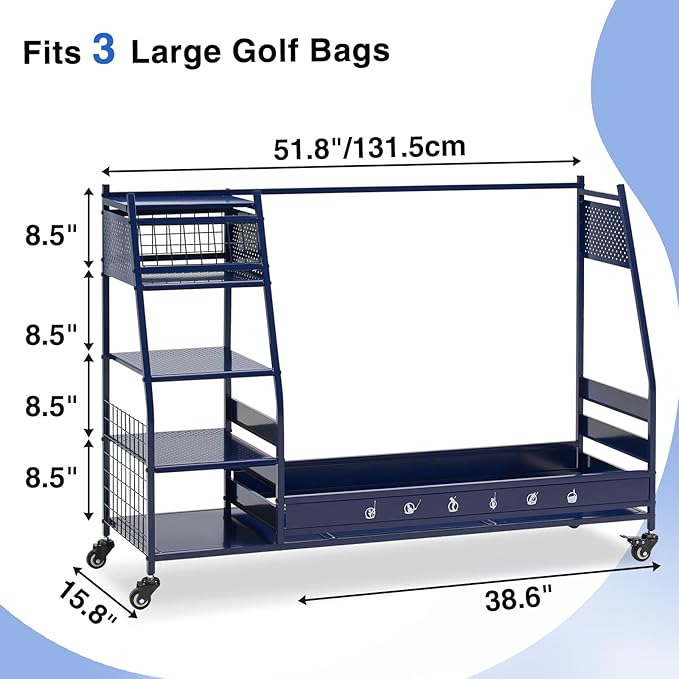 - Easy to Move & Stable When Stationary: The golf club storage stand with storage has 4 wheels that can rotate 360°, and you can push the garage storage stand to wherever you want. 2 of the 4 wheels can be locked, allowing flexible movement while maintaining sufficient stability in the placement position of the golf bag rack holder. The assembled freestanding garage storage station features 51.8'' L x 15.8'' W x 34.3'' H. Please measure where you want to put it before buying