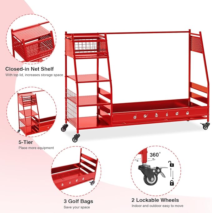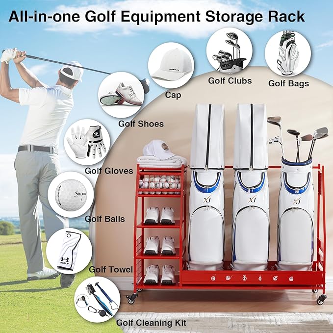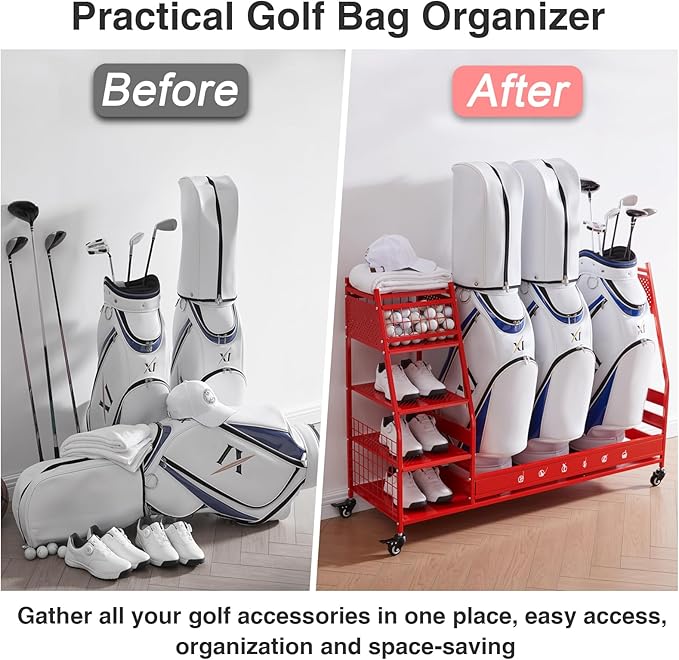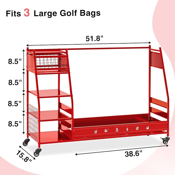 - Multi Occasions: Our golf bag storage can organize almost all your golf accessories, keep your sports and golf equipment in one place, say goodbye to cluttered garages, basements, homes, yoga studios, golf clubs, athletic departments, and storage rooms that are easy to access and space-saving. Valentine's Day is coming up, this superior quality uniquely designed golf ball rack is the ideal Valentine's gift for your boyfriend or husband