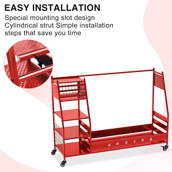 - Easy to Move & Stable When Stationary: The golf club storage stand with storage has 4 wheels that can rotate 360°, and you can push the garage storage stand to wherever you want. 2 of the 4 wheels can be locked, allowing flexible movement while maintaining sufficient stability in the placement position of the golf bag rack holder. The assembled freestanding garage storage station features 51.8'' L x 15.8'' W x 34.3'' H. Please measure where you want to put it before buying