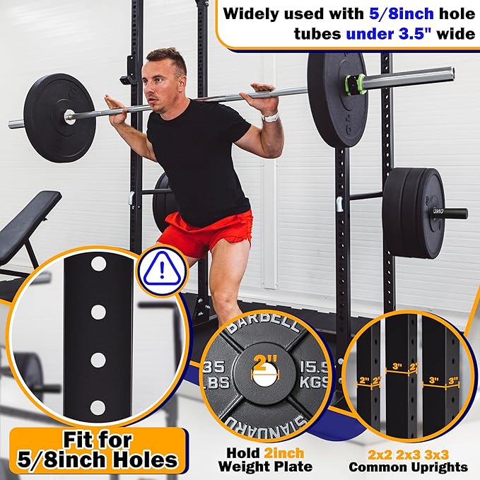 - Universal Fit: The Power Rack and Squat Rack Weight Plate Holder is compatible with 2"x2", 3"x3", and 2"x3" upright racks with 5/8 holes, providing a versatile storage solution that saves space