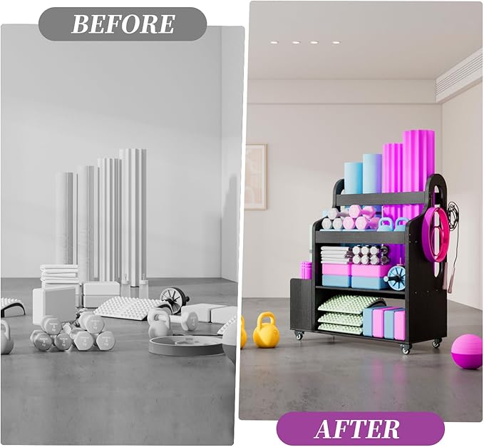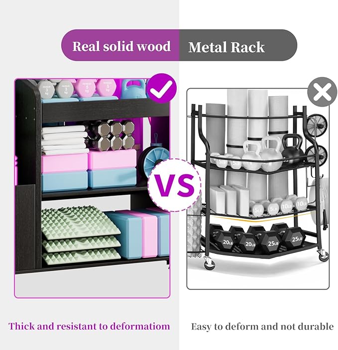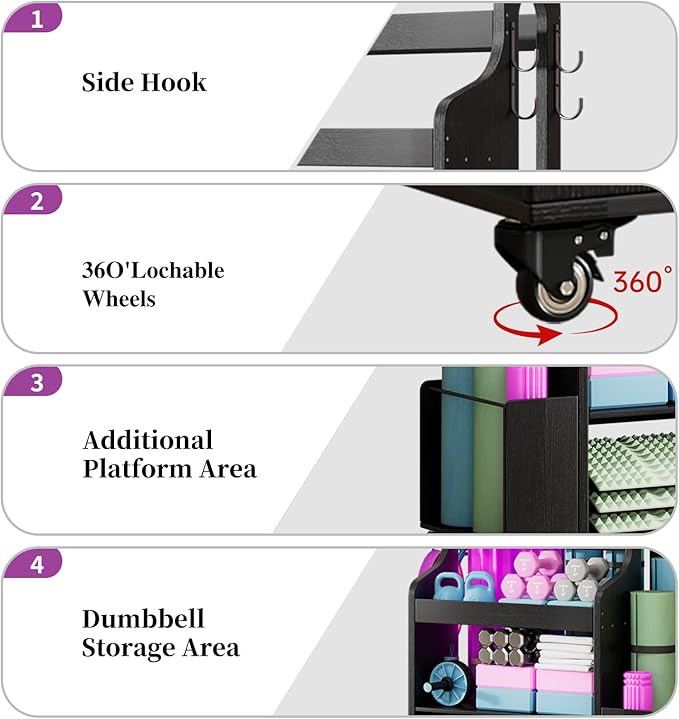 - Extra Large Capacity: Our workout storage rack equipped with 3 layers of dumbbell storage racks, a side basket for yoga mat and foam roller, 4 side storage hangers for storing resistance band and roller wheels.