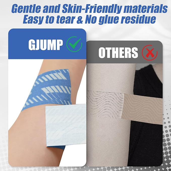 - PREMIUM MATERIALS: GJUMP kinesiology tape is crafted from 96% natural cotton and 4% elastic spandex fibers, making it hypoallergenic, latex-free and odorless. It is designed to minimize the risk of skin irritation, itching, and blistering, ensuring a gentle and supportive experience.