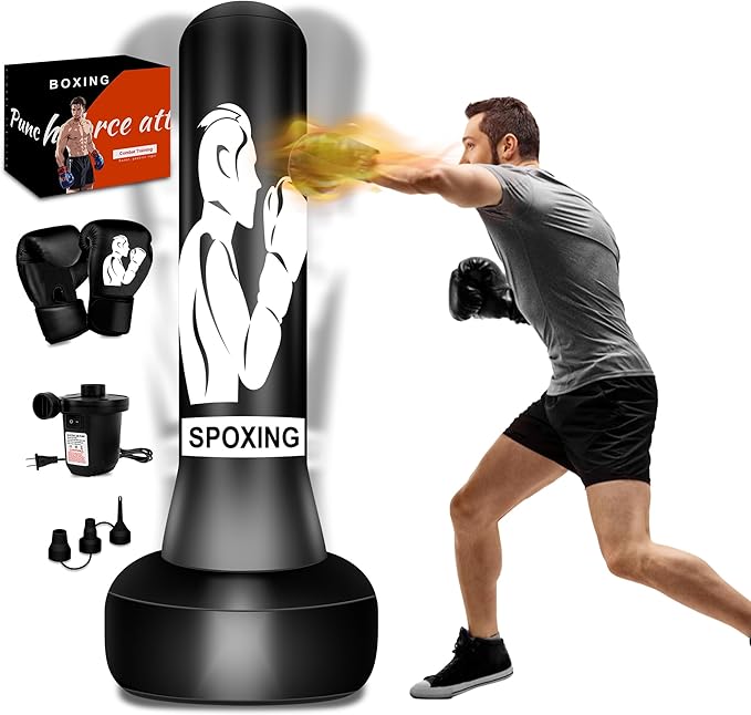 - Professional Boxing Punching Bag Set: With our equipment, you will get a complete set of boxing training tools: a stand-alone punching bag, a pair of boxing gloves and an electric air pump, everything you need. No need to buy an extra air pump, it is easy to inflate, saving you time and energy. Our gloves are designed to provide top-level protection for your hands, allowing you to punch with confidence