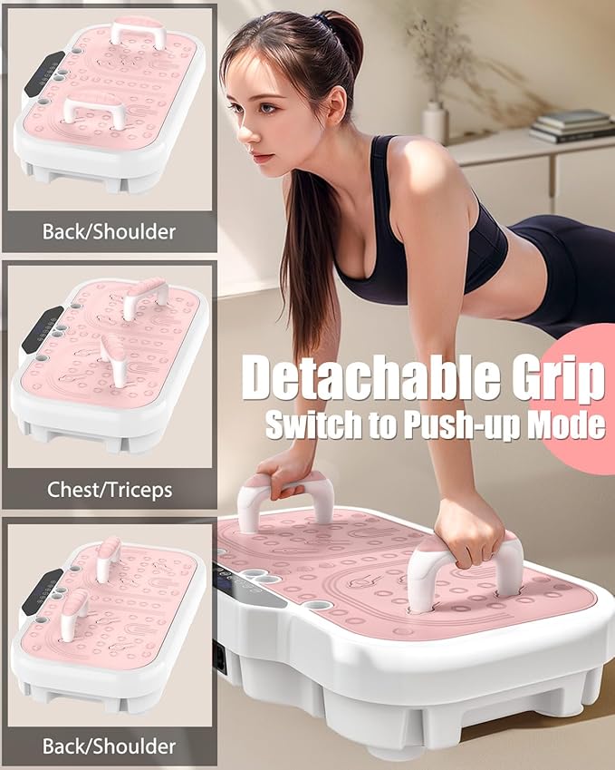 - 【UNIQUE DESIGN】Add adjustable grips for true all-in-one functionality. Whether you're shedding fat or building muscle, from upper body to lower body, this vibration plate will fulfill all your workouts.
