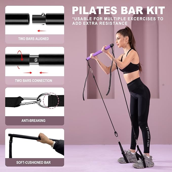 - 【Home Portable Gym】The Ultimate Pilates Stick set can be used in Pilates, stretching, yoga, strength training and other training programs to effectively exercise the ab, arms, legs, hips, waist, triceps and back. More than 30 exercises can be completed with different workout combinations, and resistance bands of different lengths can be suitable for short and tall people, as an alternative to traditional large fitness machines.