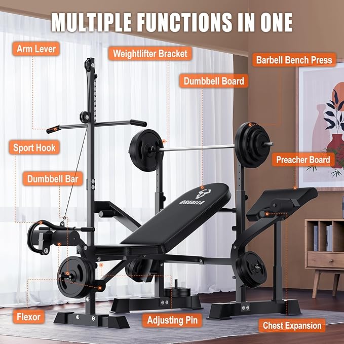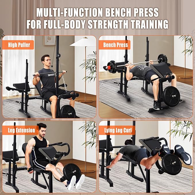 - 8-in-1 Multi-Functional Home Gym Weight Bench: Perfect for bench press, dumbbell flies, shoulder press, sit-ups, leg workouts, and more. Compatible with dumbbells, barbells, resistance bands, and other accessories. Replace multiple gym machines with this all-in-one, cost-effective solution – ideal for home gyms. The adjustable design adapts to all fitness levels, from beginners to advanced users