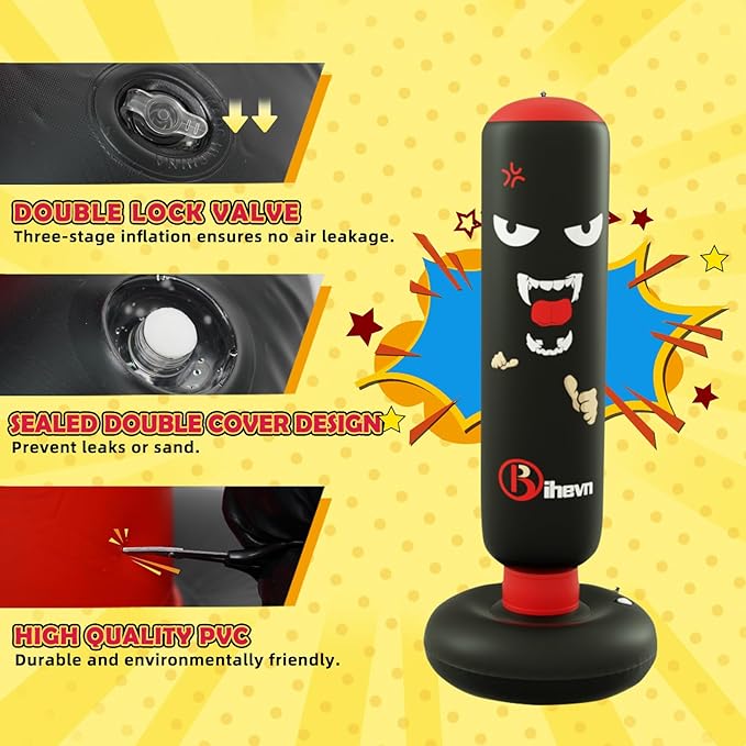 - - Fun and Safe for Children: With no sharp edges or hard parts, this punching bag combines fitness and fun together, making it an ideal sports toy. It can help children release stress and develop optimistic and brave characteristics, perfect for their "ventilation". (Safe and fun boxing toys for children)