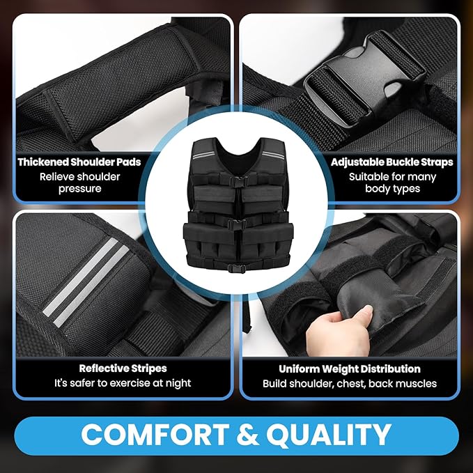 - Adjustable Weight Vest: The weight vest features an adjustable size buckle design, making the weighted vest more inclusive and suitable for a variety of body types, allowing the weight vest to fit more closely, increasing comfort and effectiveness during exercise