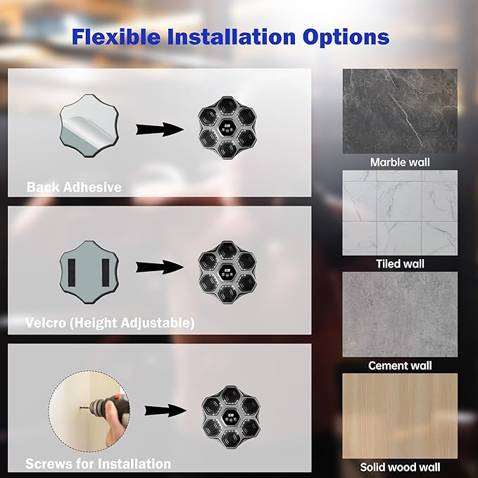 - 【9 Modes & Speed Options】Featuring 9 dynamic modes and adjustable speed levels (1-9), this punching trainer caters to users of all skill levels. The LED display tracks your hits and records progress, while Bluetooth connectivity lets you play your favorite workout songs. Enjoy a fun, challenging, and comprehensive muscle workout that boosts reflexes and keeps you motivated