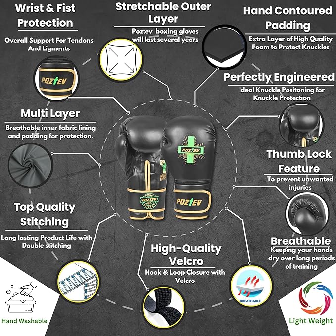 - SUPERIOR PROTECTION & SAFETY: Crafted with multi-layer padding and advanced shock-absorbing technology, POZTEV boxing gloves offer superior protection for your hands and wrists during intense workouts and sparring sessions. Designed to reduce impact and safeguard against injury, these gloves ensure every punch feels solid and safe, letting you focus on training without worry. Ideal for experienced boxers and sparring enthusiasts.