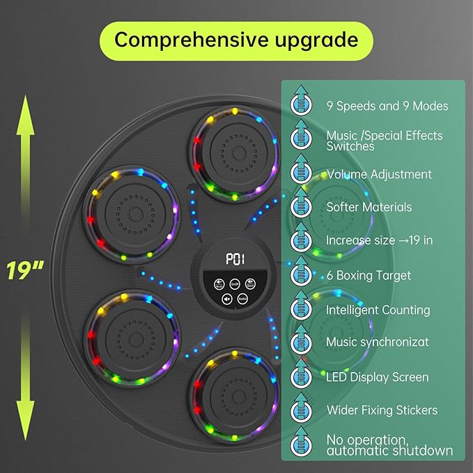 - 【 Comprehensive Upgrade 】: Music boxing machine offers up to 9 speeds and 9 modes, with added special effects switches ,volume adjustment,and Softer materials.The intelligent counting function of the boxing machine can record every hit, better helping users evaluate their own growth.