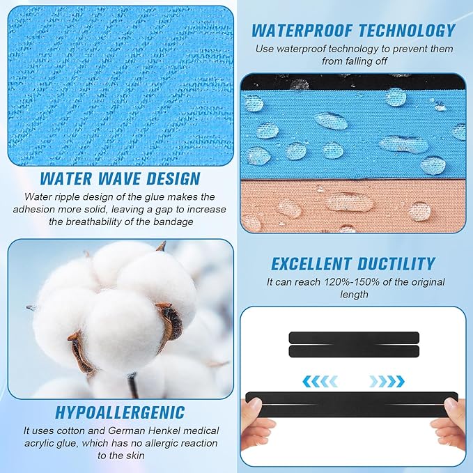 - COMFORTABLE & BREATHABLE: Our sports tape strips are made of cotton and spandex yarn, which are skin-friendly, lightweight, latex-free and drug-free. The tape adopts German high-quality adhesive technology, and the water ripple design makes the sports tape extremely sticky and breathable, allowing you to exercise and sweat confidently. If used properly, it can withstand up to 2-3 days of maximum exercise.