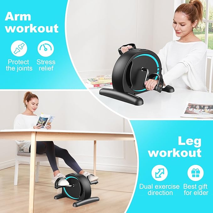 - 【WORK FROM HOME FITNESS】This under desk cycle combining arm and leg exercises, not only allows you to exercise to the muscles and joints of the knees, ankles, feet, but also can be used on the table to exercise the arms, wrists, shoulders and other joints. It is used for office workers, elderly people, people with sports injuries, and rehabilitators to do physical therapy to relieve pain, restore and maintain motor function.