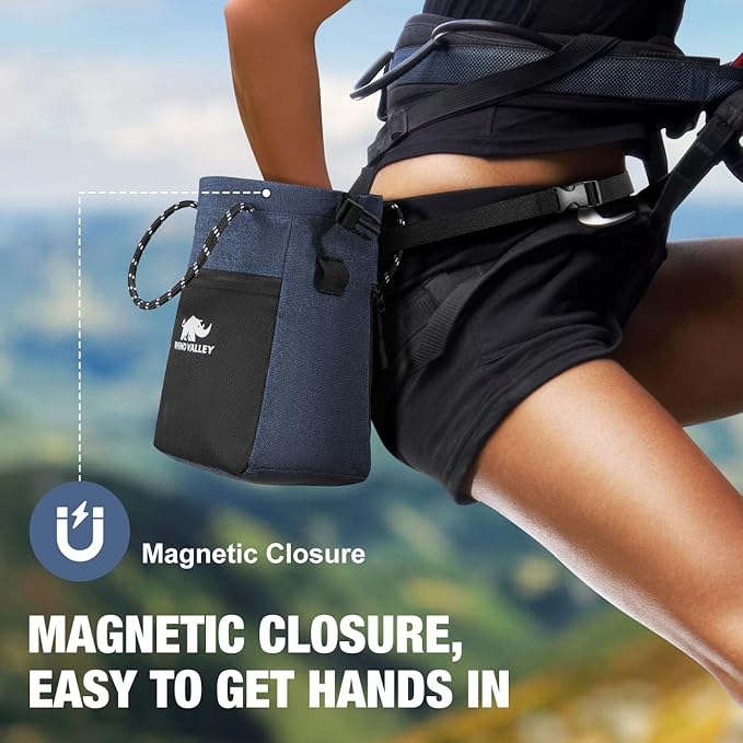 Rhino Valley Chalk Bag for Rock Climbing, No Leak Magnetic Climbing Chalk Bag with Handle, Climbing Chalk Bucket Gear with Adjustable Belt Zipper Pockets for Cross Fit, Weight Lifting