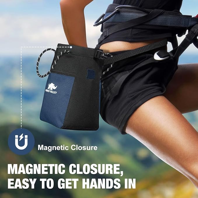 Rhino Valley Chalk Bag for Rock Climbing, No Leak Magnetic Climbing Chalk Bag with Handle, Climbing Chalk Bucket Gear with Adjustable Belt Zipper Pockets for Cross Fit, Weight Lifting