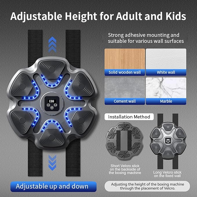 - ππππ πππ ππ π ππππππ ππππππππππππ - Flexible installation options, adjustable height suits adults and kids, saving 90% installation time. Compact design fits homes, offices, or gyms and 2 extra velcro straps are provided to facilitate you to use music boxing machine between different places