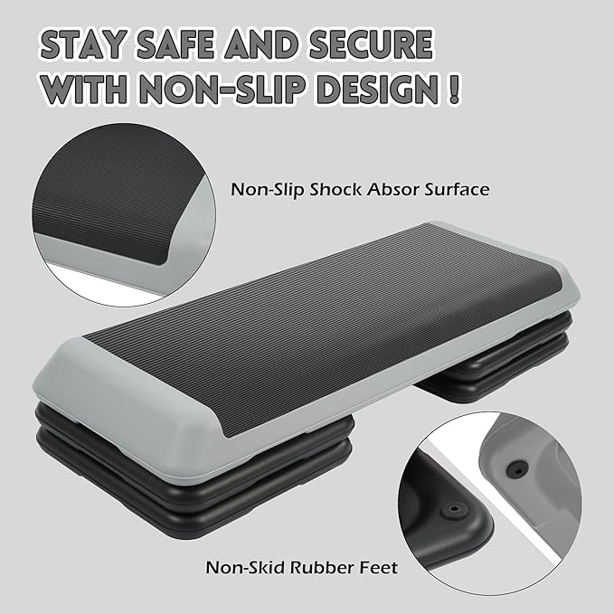 - Non-Slip & Shock-Absorbing: Grooved, nonslip top that absorbs shock, preventing slips and allowing you to focus on safe, effective movements during every workout. Each riser has four nonskid feet, preventing slipping or floor damage, whether used on carpet or hardwood, keeping your workout stable and safe.