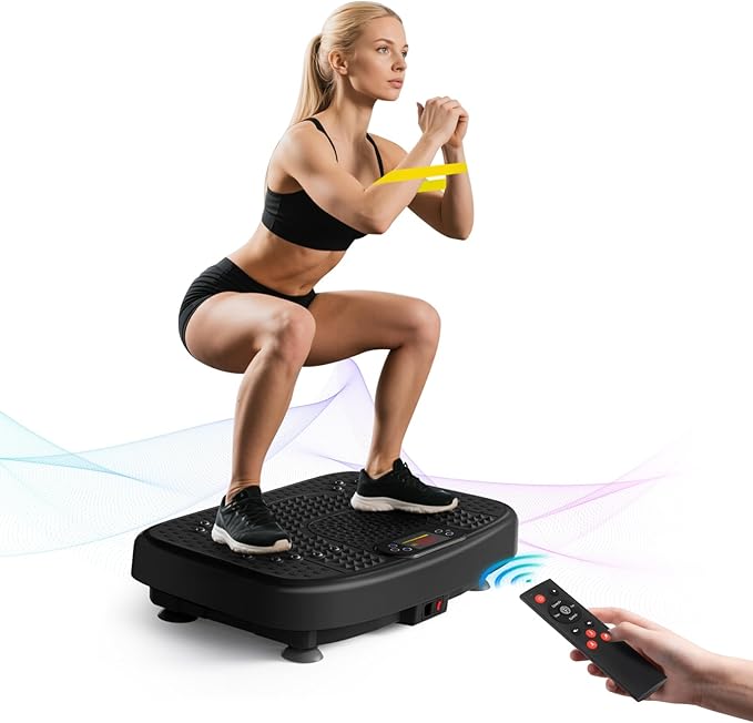 • Easy to Use and Store: The slim vibrating plate can be operated using the remote control or via the LED touch screen. The display shows you the time and speed, giving you a clear overview of your workout. The non-slip coated design and impact-resistant ABS housing ensure longevity and protect the motor. Compact and space-saving, you can exercise at home, in the office, or in other places at any time without being restricted by space