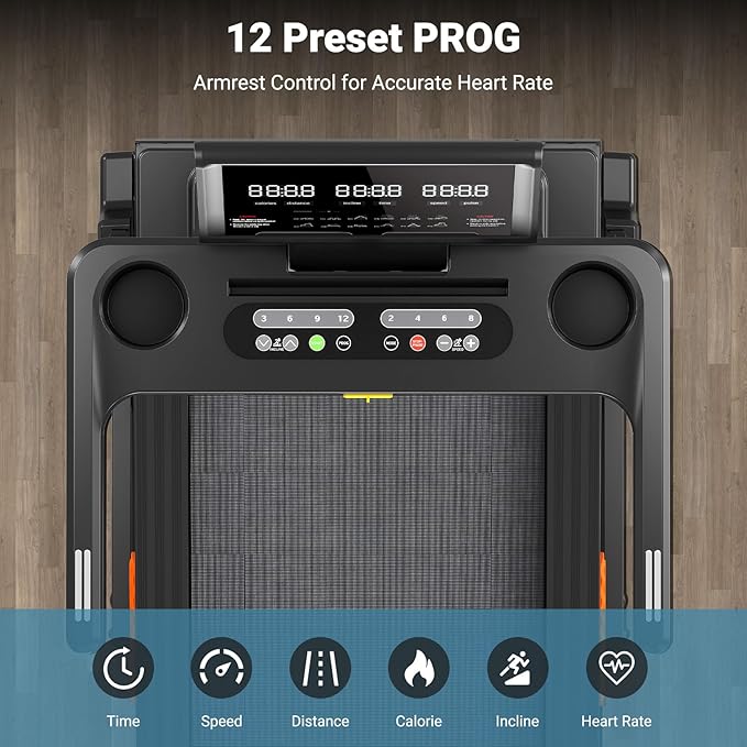 - [REAL TIME DIGITAL MONITOR] This portable treadmills for home can easily keep track of your progress during your workout. The large, adjustable LED console displays Calories, Distance, Pulse, Speed, and Time. Use convenient grip sensors to track your heart rate in real-time