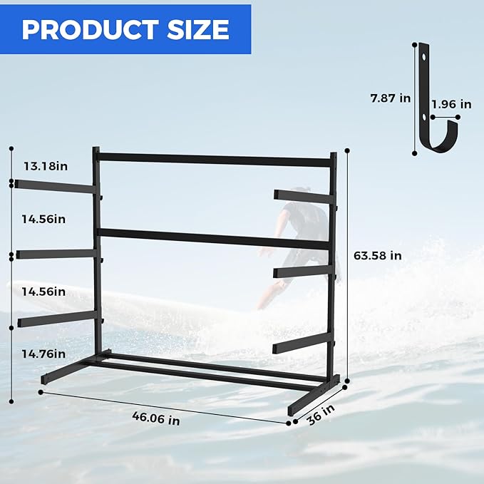 - Spacious Storage: This outdoor kayak storage rack can accommodate a variety of gear, including kayaks, canoes, surfboards, and paddleboards with a total weight capacity of up to 300 pounds. It's perfect for meeting your everyday storage needs. By using this rack, you can efficiently conserve space and maintain an organized, tidy, and clean play area.