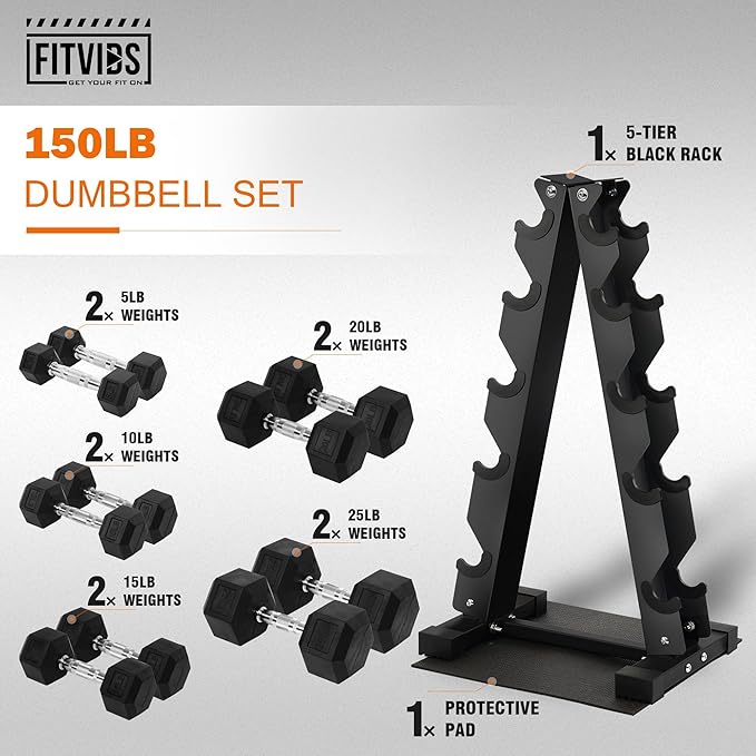 Rubber Coated Hex Dumbbell Weight Set and Storage Rack, 100LB Set or 150LB Set, 5-20 lbs Pairs or 5-25 lbs Pairs