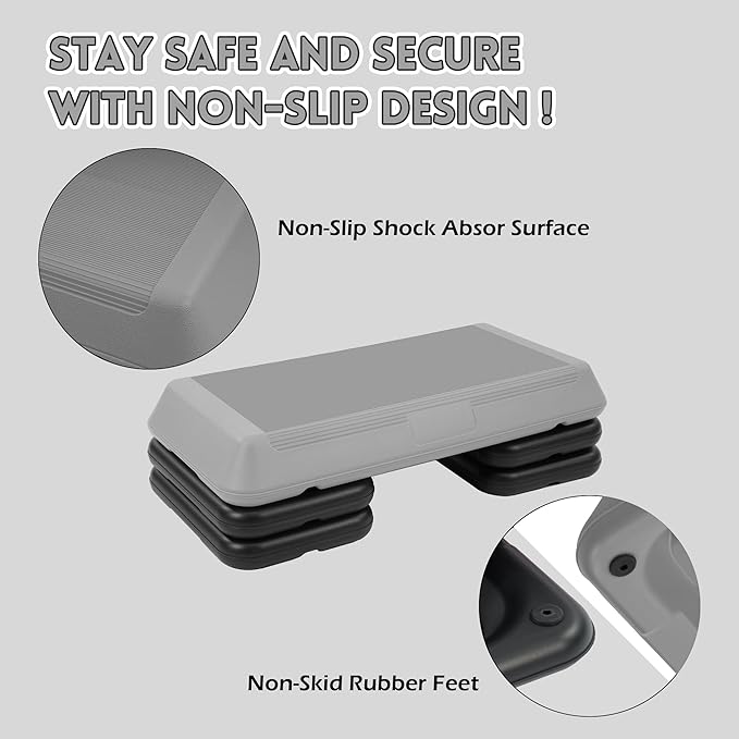 - Non-Slip & Shock-Absorbing: Grooved, nonslip top that absorbs shock, preventing slips and allowing you to focus on safe, effective movements during every workout. Each riser has four nonskid feet, preventing slipping or floor damage, whether used on carpet or hardwood, keeping your workout stable and safe.