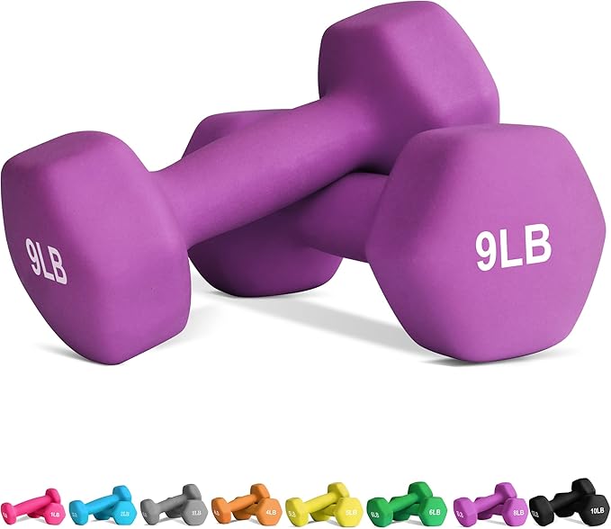 - PACKAGE INCLUDES: This weight set includes two 9 lb neoprene dumbbells (18 pounds total), making them perfect for yoga exercises and other on-the-go workouts.