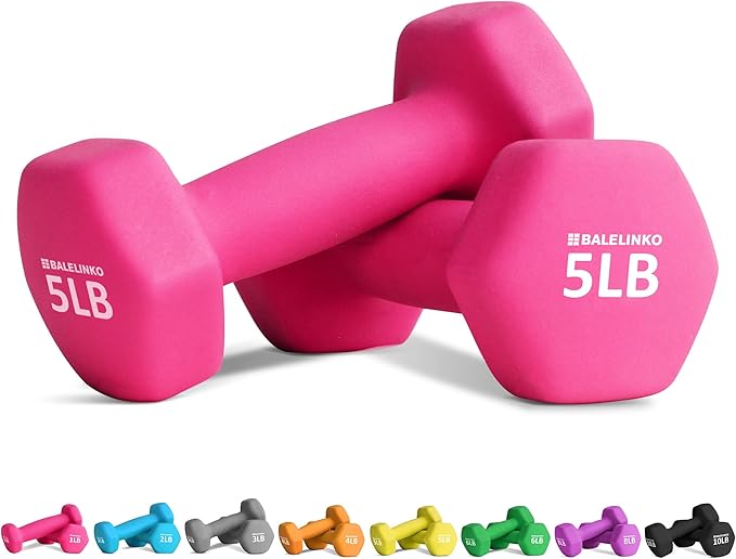 - STYLISH AND MODERN: Balelinko neoprene coated dumbbell weights are sold in pairs and available in 1, 2, 3, 4, 5, 6, 8, 10, 12, 15pounds, which allow you vary the intensity of your workouts. Bright colors and large, clear numbers make these quick and easy to grab while in the zone.