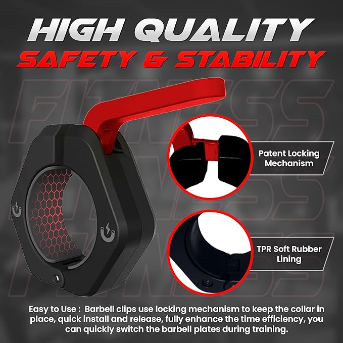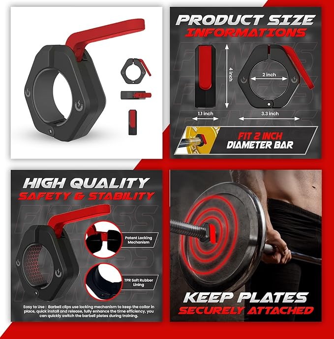 - Olympic Size Compatibility: Designed specifically for Olympic-size barbells, are the perfect companion for weightlifting enthusiasts. With a 2-inch diameter, these clamps are compatible with standard Olympic barbells, allowing you to securely lock your weights in place. Say goodbye to wobbling plates and hello to a stable and sturdy workout routine. Take your weightlifting to the next level with our Olympic size Barbell Clamps.