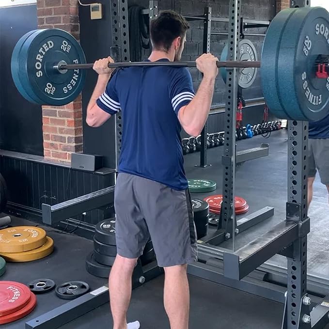 - Adjustable -- Easily adjust safety catches to preferred height for squats or bench presses. Simply twist & pull spotter arm & insert into desired height. Reinforced with rubber padding to reduce weight room noise & protect the finish of your bar.