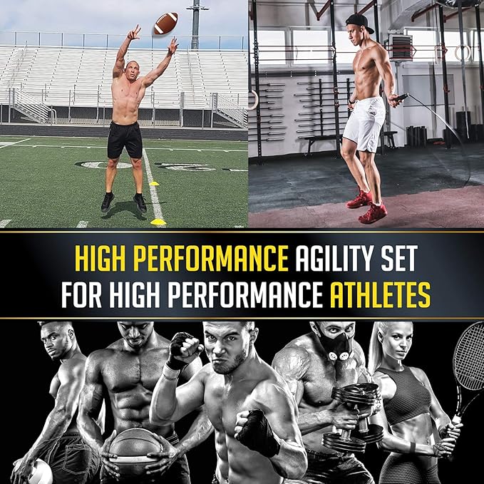 - "DOUBLE YOUR AGILITY & SPEED TRAINING WORKOUT RESULTS: Our professional athletes and fitness clients have shown 77% - 117% MORE ATHLETIC RESULTS including agility, speed, and footwork improvements when using our EXERCISE BANDS, JUMP ROPE, AGILITY LADDER, AND SPEED CONES equipment in combination versus with agility ladder or speed cones alone. Set New Personal Records whether you're a football, soccer, basketball, hockey or any sport athlete or Fitness Training enthusiast!"