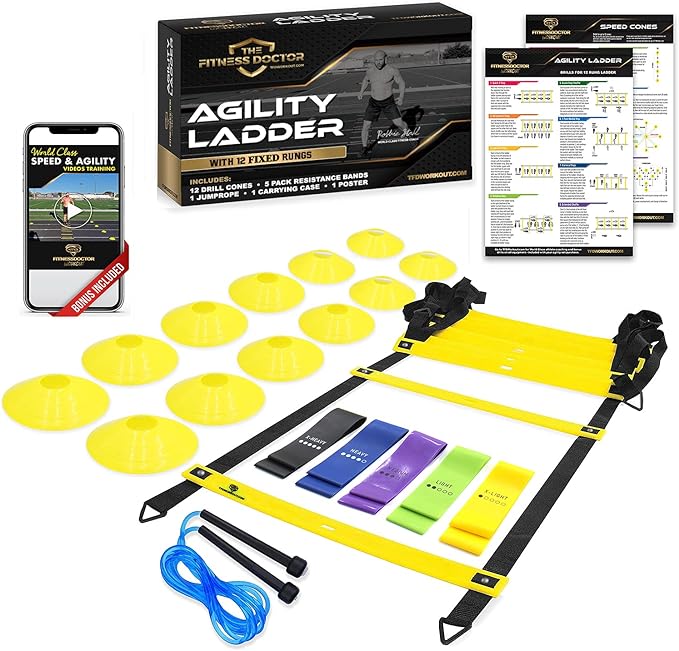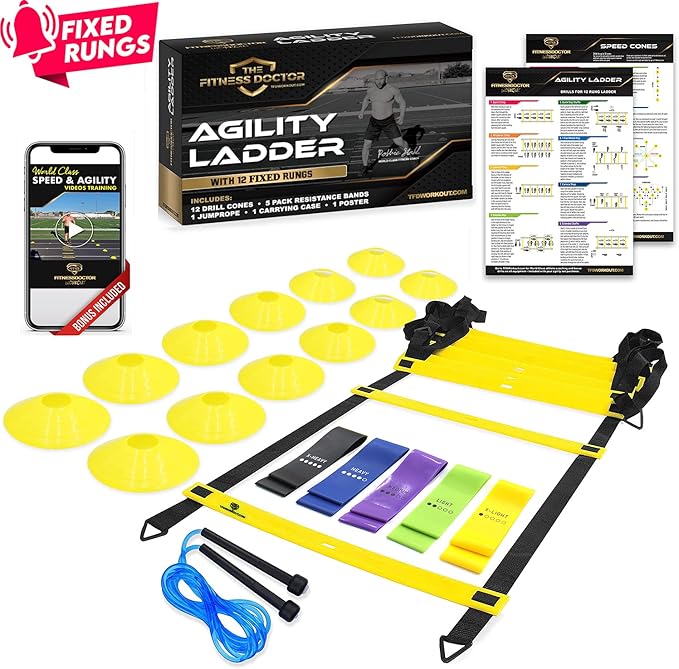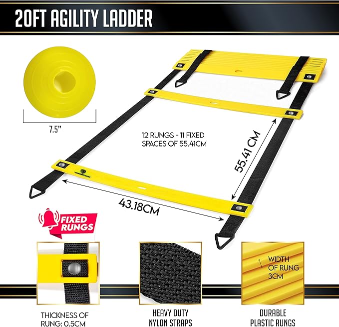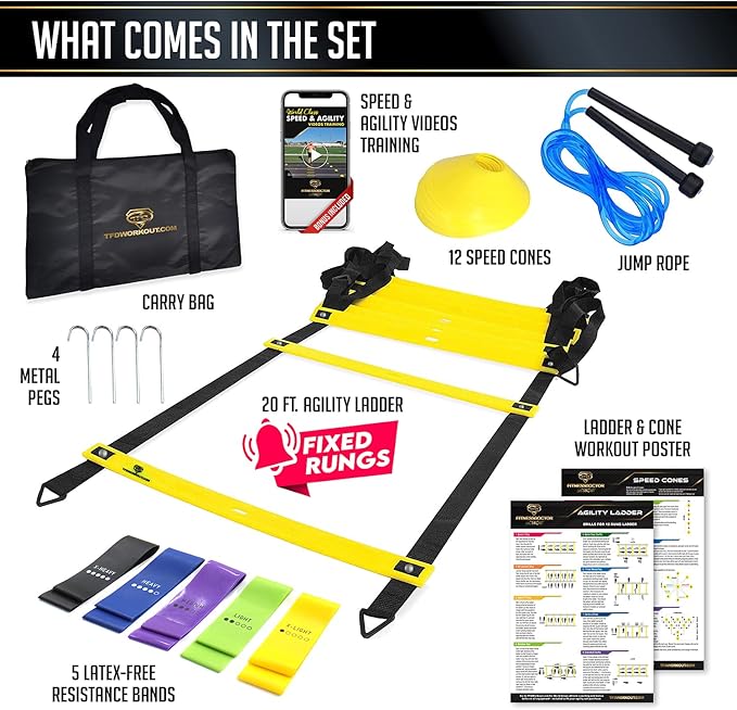 - ULTRA DURABLE PROFESSIONAL GRADE AGILITY & SPEED SET INCLUDES: 20ft Fixed Agility Ladder, 4 metal pegs for securing ladder, 12 speed cones for short or longer drills, 5 varying resistance exercise bands for adding strength to drills, jump rope for footwork timing and speed, carrying bag for easy transportation, agility ladder and speed cone drills poster for easy drills reference, and a World Class multi-part training plan designed to double your results from your new equipment.