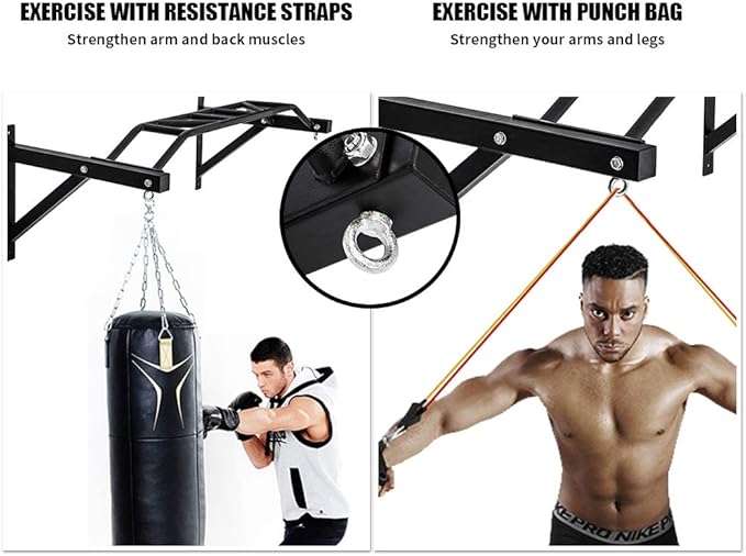 - 2 Hinged Rings: Strong enough to attach additional trainng accessories: punch bags, TRX strap, power ropes or yoga straps, offering countless possibilities for your exercises.